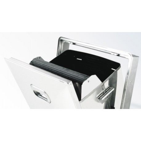 Der aus Edelstahl gefertigte Kippbehälter mit Schlagstange ist in drei verschiedenen Größen erhältlich. Er verfügt über einen herausnehmbaren Innenbehälter, der das Entleeren und die Reinigung erleichtert. Das Modell EK3075/10/B zeichnet sich durch einen Ausschnitt von 437 x 482 mm und eine Tiefe A/B von 280/310 mm aus. Die Gesamthöhe C beträgt 330 mm, und der minimale benötigte Platz E beträgt 370 mm.