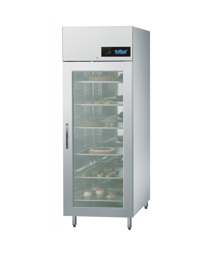 Kühlschrank mit Glastür, Zwangsumluft, automatischer Abtauung und Kondenswasserverdunstung durch Heißgas, mit digitaler Temperaturregelung. Zentrale Kühlung mit Kondenswasserablauf. Hygienisch gefertigter Innenraum mit abgerundeten Kanten und geprägtem Boden. Verdampfer außerhalb des Kühlraums angebracht. Monobloc-Aggregat oben am Gerät angebracht.