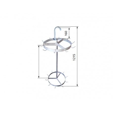 Aufhänger auf Gleitkonsole, bestimmt zum Aufhängen von Innereien oder Nebenprodukten. Eingesetzt in der Fleisch- und Schlachtindustrie. Der Innereienaufhänger verfügt über zwei Ringe mit einem Durchmesser von 45 cm, die jeweils mit 10 Haken ausgestattet sind.