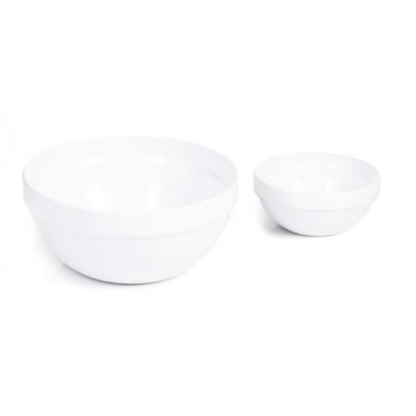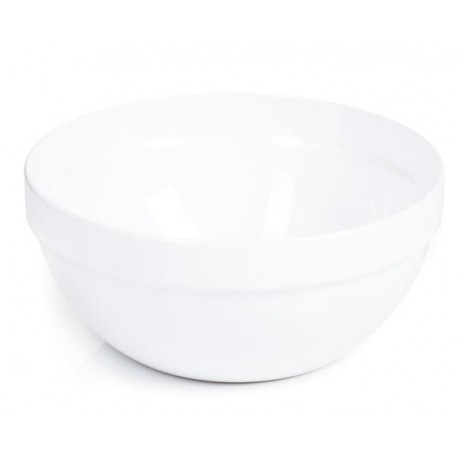 Salatschüssel aus weißem Melamin. Spülmaschinengeeignet, kühlschrankgeeignet und stapelbar. Temperaturbeständig von -30 bis +70 Grad Celsius.