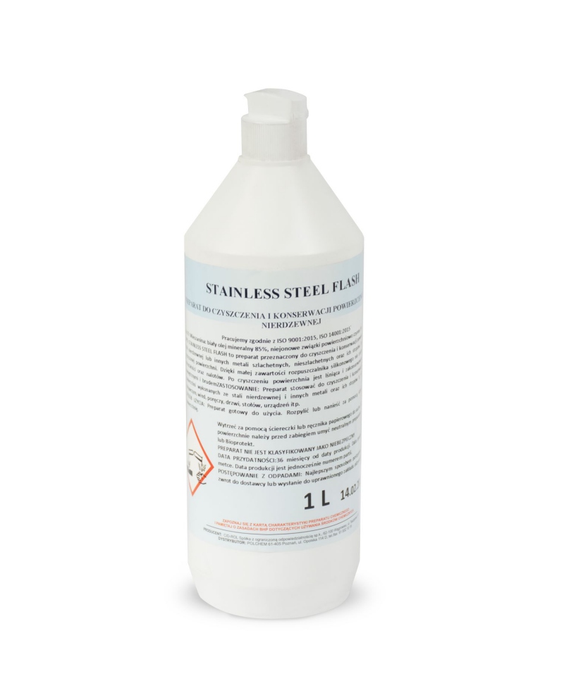 STEEL FLASH ist ein Mittel zur Reinigung und Pflege von Oberflächen aus Edelstahl oder anderen Edelmetallen, unedlen Metallen und deren Legierungen. Es verdampft schnell von der zu reinigenden Oberfläche. Aufgrund des geringen Gehalts an Silikonlösungsmittel hinterlässt es keine Streifen, fettigen Rückstände oder Ablagerungen. Nach der Reinigung ist die Oberfläche glänzend und vor äußeren Einflüssen und Schmutz geschützt. Das Mittel wird zur Reinigung und Pflege aller Arten von Oberflächen aus Edelstahl und anderen Metallen sowie deren Legierungen verwendet, z. B. Maschinen in der Lebensmittelindustrie, Aufzüge, Geländer, Türen, Tische, Geräte usw. Das Mittel ist gebrauchsfertig. Auf die zu reinigende Oberfläche sprühen oder mit einem Tuch auftragen. Mit einem Tuch oder Papiertuch trocken nachwischen. Stark verschmutzte Oberflächen sollten vor der Behandlung mit einem neutralen Reinigungsmittel wie z. B. Kama oder Bioprotekt gereinigt werden.