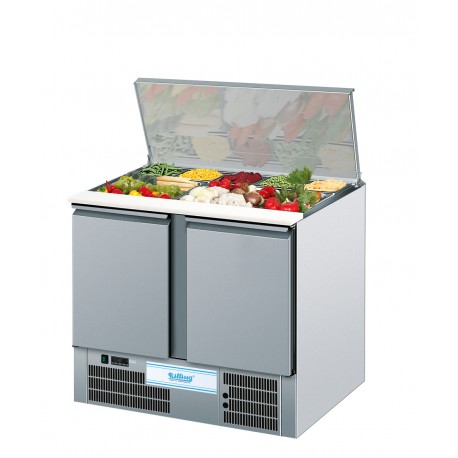 2-türige Saladetta mit Schiebetür und Schneidebrett, Verdampfer in der Rückwand vergossen, Zwangsumluft, automatische Abtauung und Kondenswasserverdunstung, elektronische Steuerung. Anschlussklar. Ohne GN-Behälter.