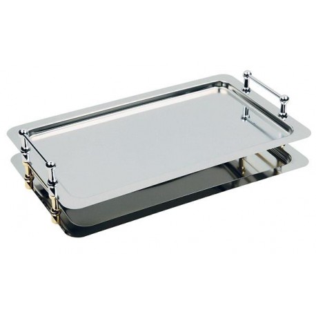 Rechteckiges Serviertablett mit angeschraubten Griffen aus Edelstahl. Der Abstand zwischen den verbundenen Tabletts beträgt ca. 40 mm. Verchromte Griffe. Spülmaschinengeeignet und stapelbar.