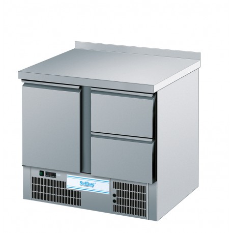 Kühltisch für GN 1/1, 1 Flügeltür und 2 Schubladen mit 152 mm Nutzhöhe, Tischplatte nach oben um 50 mm gebogen (Typ C), Verdampfer in der Rückwand vergossen, Zwangsumluft, automatische Abtauung und Kondenswasserverdunstung, elektronische Steuerung. Anschlussklar.