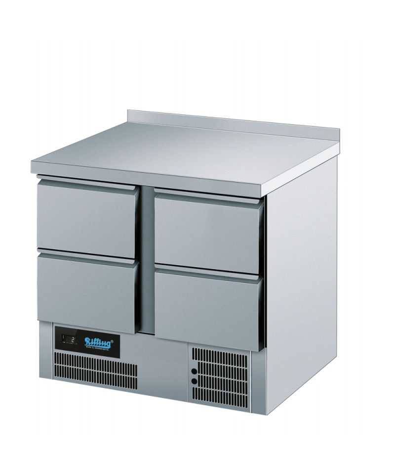 Kühltisch für GN 1/1, 4 Schubladen mit 152 mm Nutzhöhe, nach oben um 50 mm gebogene Tischplatte (Typ C), Verdampfer in der Rückwand vergossen, Zwangsumluft, automatische Abtauung und Kondenswasserverdunstung, elektronische Steuerung. Anschlussklar.