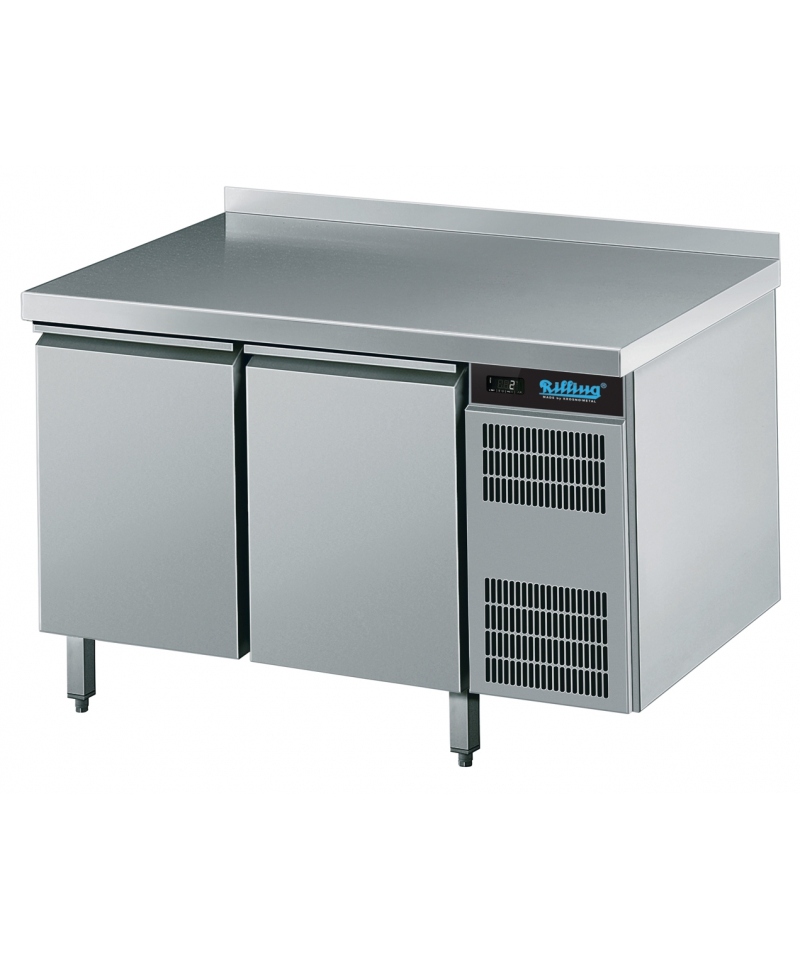 2-türiger Kühltisch für GN 2/3, Tischplatte mit 50 mm hohem Rückwandrand (Typ C), Verdampfer oben im Gerät vergossen, Zwangsumluft, automatische Abtauung und Kondenswasserverdunstung durch Heißgas, elektronische Steuerung, hygienische Ausführung, anschlussfertig.