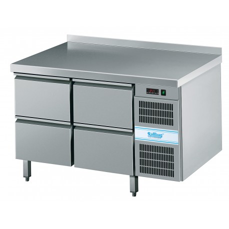 Kühltisch für GN 1/1, 4 Schubladen mit 160/216 mm Nutzhöhe, Tischplatte mit 50 mm hohem Rückwandrand (Typ C), Verdampfer oben im Gerät vergossen, Zwangsumluft, automatische Abtauung und Kondenswasserverdunstung durch Heißgas, elektronische Steuerung, hygienische Ausführung, anschlussfertig.