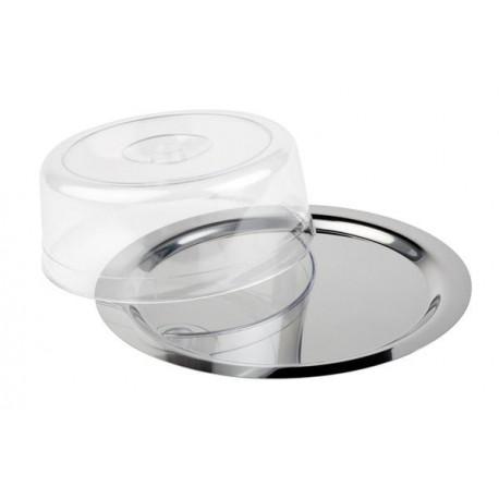 Das Set besteht aus einem Edelstahltablett mit glattem Rand (Ø 380 mm) und einem transparenten Kunststoffdeckel. Spülmaschinengeeignet und stapelbar.
