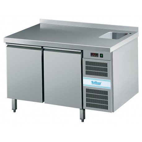 2-türiger Kühltisch für GN 1/1, Tischplatte mit 50 mm hohem Rückwandrand (Typ C), Verdampfer oben im Gerät vergossen, Zwangsumluft, automatische Abtauung und Kondenswasserverdunstung durch Heißgas, elektronische Steuerung, hygienische Ausführung, anschlussfertig. Ø 35 mm Ausschnitt für Armatur. Waschbeckenabmessungen: 250 x 250 x 200 mm. Mit Siphon.