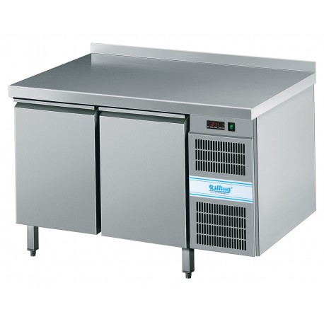 2-türiger Tiefkühltisch für GN 1/1, Tischplatte mit 50 mm hohem Rückwandrand (Typ C), Verdampfer oben im Gerät vergossen, hocheffizientes Zwangsumluftsystem, automatische Abtauung und Kondenswasserverdunstung durch Heißgas, elektronische Steuerung, hygienische Ausführung, anschlussfertig.