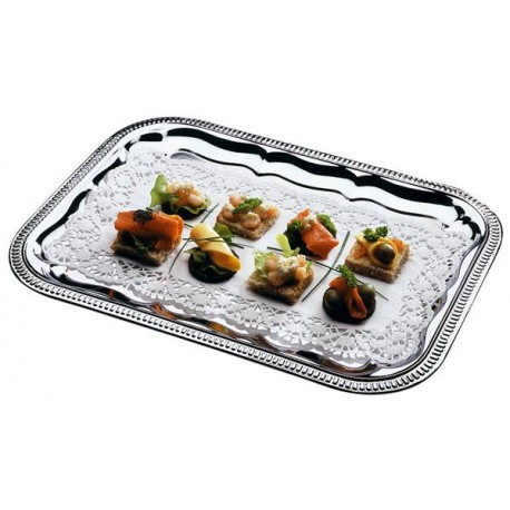 Serviertablett aus verchromtem Stahl mit umlaufendem, dekorativem Rand, nicht säure-, öl- und soßenbeständig. Speisen sollten auf einer Papierserviette auf dem Tablett serviert werden. Das Tablett ist nicht spülmaschinengeeignet. Stapelbar.