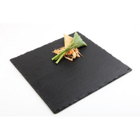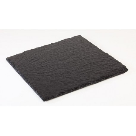 Servierplatte aus Naturschiefer. Gekühlt besitzt sie hervorragende wärmeisolierende Eigenschaften. Die speziell imprägnierte, wasserabweisende Oberfläche ermöglicht den direkten Kontakt mit Lebensmitteln. Die Kanten des Tabletts sind gebrochen, wodurch die natürliche Struktur des echten Steins sichtbar wird. Die quadratische Schieferplatte ist nicht spülmaschinengeeignet. Stapelbar.