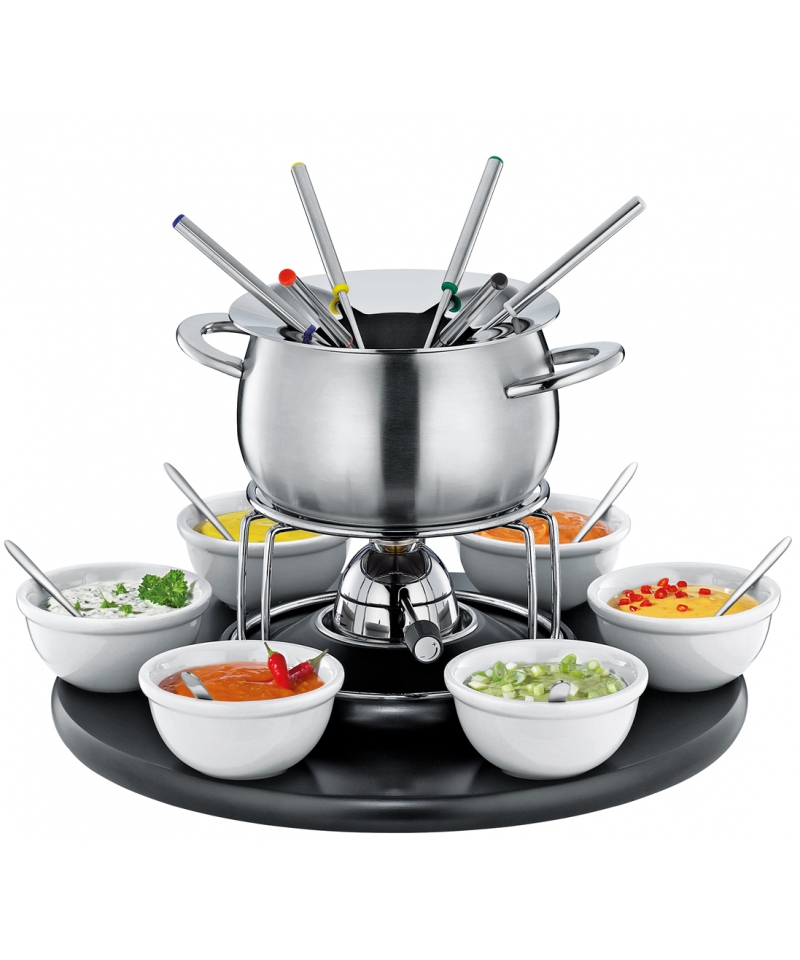 22-teiliges Fondue-Set KARUSSELL. Im Set enthalten: Topf aus gebürstetem Edelstahl 18/10, 2 Liter Fassungsvermögen, drehbarer schwarzer Holzsockel, Brenner, 6 Fonduegabeln, 6 Schälchen, 6 Löffel.