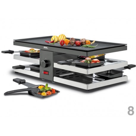 Hochwertiger Grill, mit dem Sie mühelos leckere Gerichte zubereiten können. Dank der acht im Set enthaltenen Antihaft-Pfännchen können Sie mehrere Gerichte gleichzeitig zubereiten. Die Temperatur des Geräts ist individuell regelbar. Er verfügt über ein starkes Heizelement, das Käse schnell und einfach schmilzt und andere Produkte erwärmt oder gratiniert.