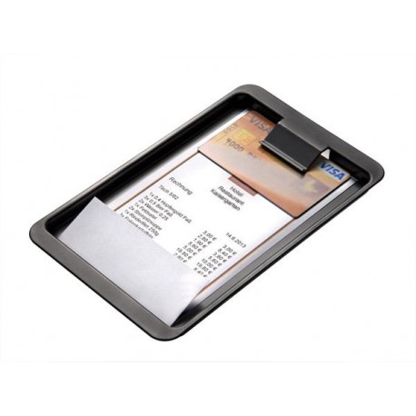 Hergestellt aus schwarzem ABS-Kunststoff. Durch das Befestigen von Beleg, Zahlungskarte oder Infoflyer am Tablett mittels Clip ist sichergestellt, dass diese an ihrem Platz bleiben und nicht herunterfallen. Finden Sie Anwendung in Restaurants, Bars, Cafés, Hotels, Pizzerien und anderen gastronomischen Betrieben. Spülmaschinengeeignet.