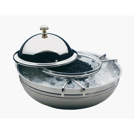 Das Set besteht aus einer Glasschüssel für Kaviar (Ø 100 mm), einem Eiseinsatz mit Gestell und hochglanzpoliertem Edelstahldeckel. Spülmaschinengeeignet und stapelbar.
