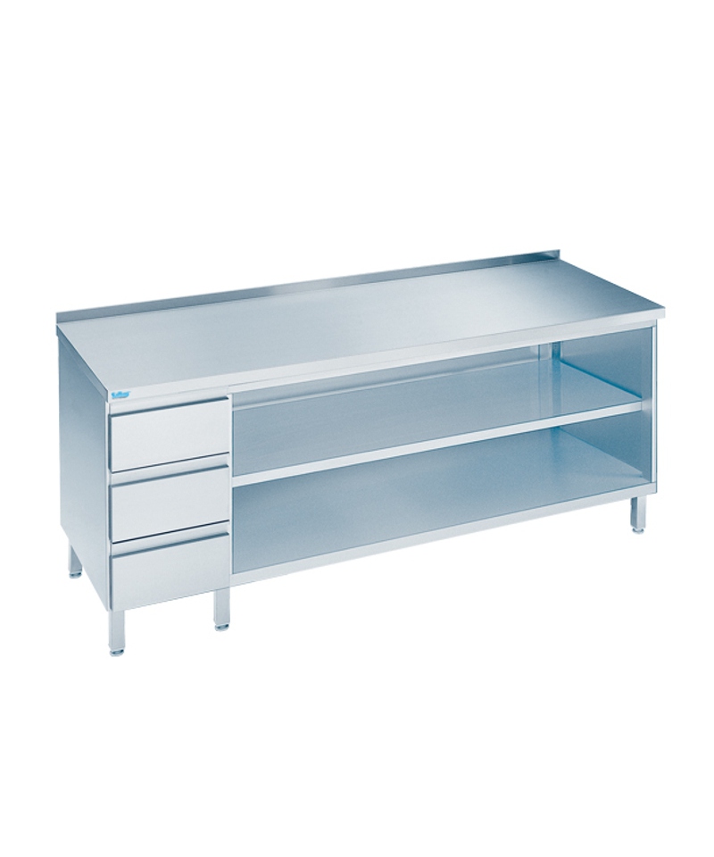 Gastronomieschrank, offen, 3 Schubladen, Fachboden, 1200x700mm, Arbeitsplatte Typ C, Rilling ASG 0712C S3L0