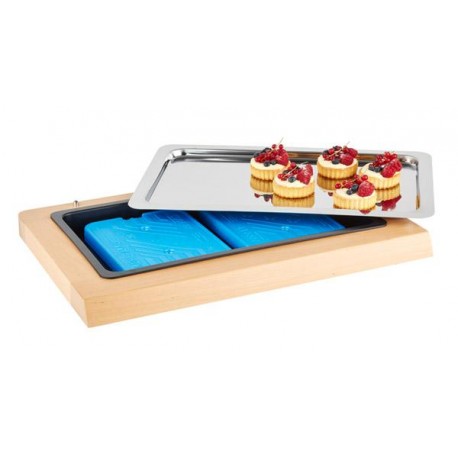 Das Set besteht aus 4 Elementen: einer Edelstahlschale GN 1/1 mit den Maßen 530x325 mm, einem Holzboden und zwei Kühleinsätzen aus Kunststoff. Der Deckel ist separat erhältlich.