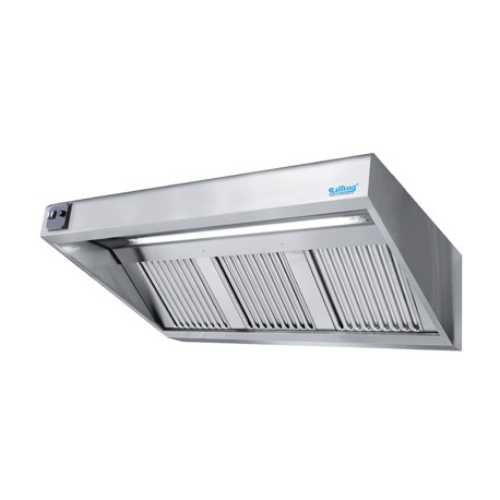 Edelstahl, mit Ventilator, analoger Steuerung, Beleuchtung und Kondensatwanne und Ablassventil, mit Labyrinthfiltern Typ B 400x500x20 mm aus Edelstahl. Geeignet für 40 mm dicke Labyrinthfilter. Mit Flansch. (Längen 1000 bis 1800 mm Flansch 210x240 mm - 180 Watt Ventilator, Länge 2000 mm Flansch 270x300 mm - 420 Watt Ventilator).
