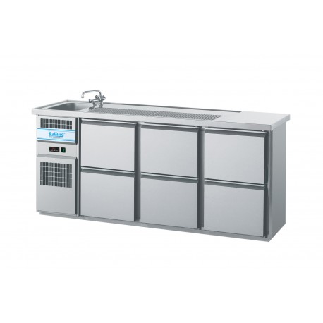3 Blöcke mit je 2 Schubladen mit einer Nutzhöhe von 345mm und 1 Spülenfach 300x500x300mm. Kühle Luftzirkulation und elektronische Steuerung. Verdampfer mit Edelstahlblech verkleidet. Kühlkorpus geschäumt mit PUR unter Druck. Ausführung: Innenraum, Front und Deckel in Edelstahl. Arbeitsplatte mit Abtropfgitter und Ablauf. Ohne Mischer und Ausgießvorrichtung.