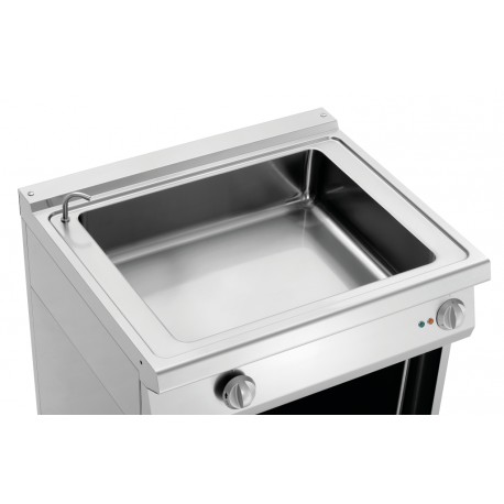 Der große elektrische Bemar aus der Serie 700 ist ein professionelles Standgerät, das sich ideal für den Einsatz in der Gastronomie eignet. Er hat einen offenen Sockel und passt sich durch die höhenverstellbaren Füße an unterschiedliche Arbeitsbedingungen an. Er wird mit 230 V betrieben und hat eine Anschlussleistung von 1 kW, ist steckerfertig und einfach zu installieren. Mit einer Kammer, Größe 1 x 1/1 GN, beträgt die maximale Tiefe des GN-Behälters 150 mm. Außerdem ist er mit einem Ablass- und Wasserzulaufhahn zur einfachen Bedienung ausgestattet. Der bemar zeichnet sich durch eine robuste Konstruktion aus CNS 18/10 aus und hat einen weiten Temperaturbereich von 30 °C bis 90 °C.