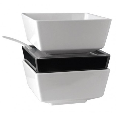 Die quadratische Schale ist aus haltbarem Melamin in Schwarz gefertigt. Sie hat rutschfeste Füße an der Unterseite und ist leicht zu reinigen.