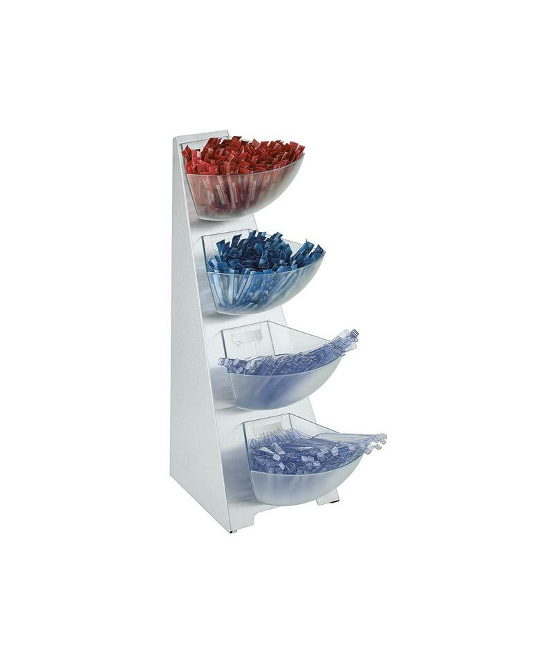 Zweistöckiges Display für kleine, abgepackte Produkte. Ideal für Snackbars, Cafés, Kantinen und Büfetts. In den Behältern können Produkte wie Zucker, Sahne, Butter, Marmelade, Ketchup bequem präsentiert werden. Das Set umfasst: einen Sockel aus satiniertem Edelstahl und zwei Behälter aus Kunststoff.