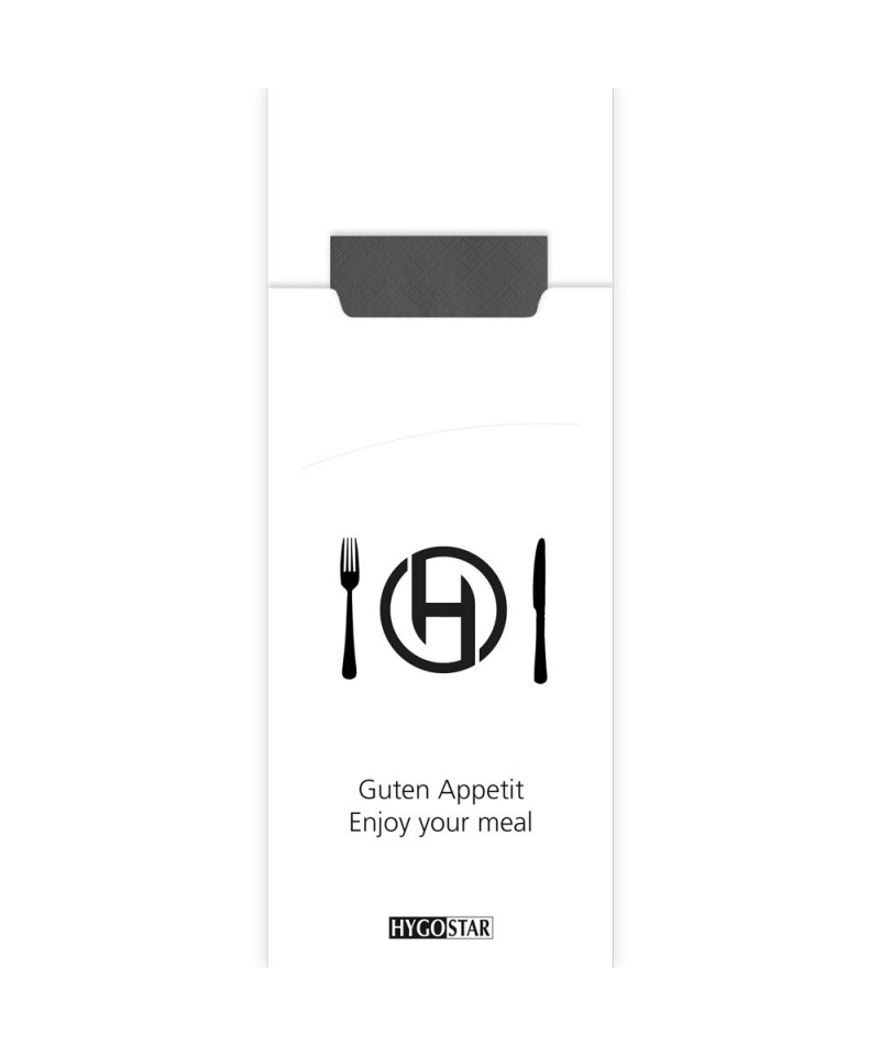 Die weiss-schwarze Kombination wirkt stilvoll und modern, sorgt für Hygiene am Platz und ermöglicht eine schnelle, professionelle Besteckausgabe. Nach dem Gebrauch kann die Tasche einfach entsorgt oder recycelt werden – eine umweltbewusste Wahl.