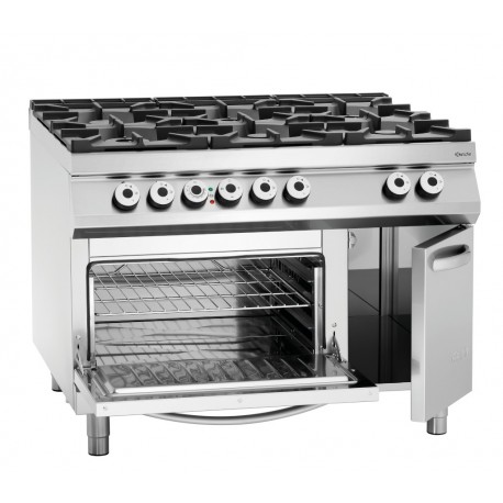 Der professionelle 6-Flammen-Gasherd ist die perfekte Kombination aus Elektrobackofen, leistungsstarken Gasbrennern und einer robusten Konstruktion, die auch den Anforderungen der anspruchsvollsten Köche gerecht wird.