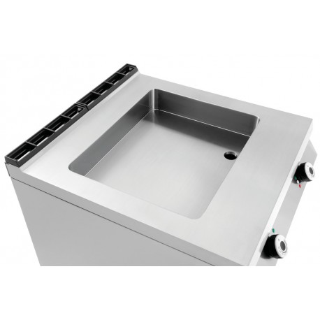Darüber hinaus ist die Pfanne mit praktischen Features wie einem Fettbehälter, einem 3 NAC-Anschluss und einem Set inklusive 1 1/2 GN-Behälter mit einer Tiefe von 200 mm ausgestattet. Die abgerundete Pfanne erleichtert das Arbeiten und die Einhaltung der Hygiene, und die höhenverstellbaren Füße ermöglichen die Anpassung an unterschiedliche Küchenbedingungen.
