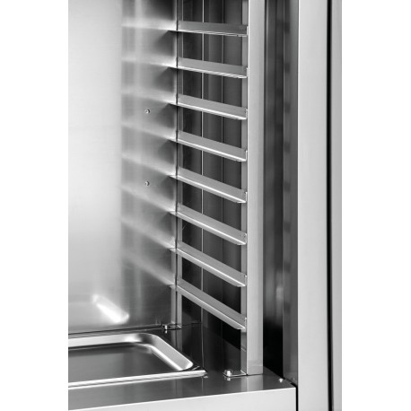 Gärschrank mit einem Temperaturbereich von 30 bis 60 Grad. Er hat 8 Rutschenpaare in GN 2/3 Gastronomie-Standardgröße und enthält einen Wasserbehälter zur Befeuchtung.