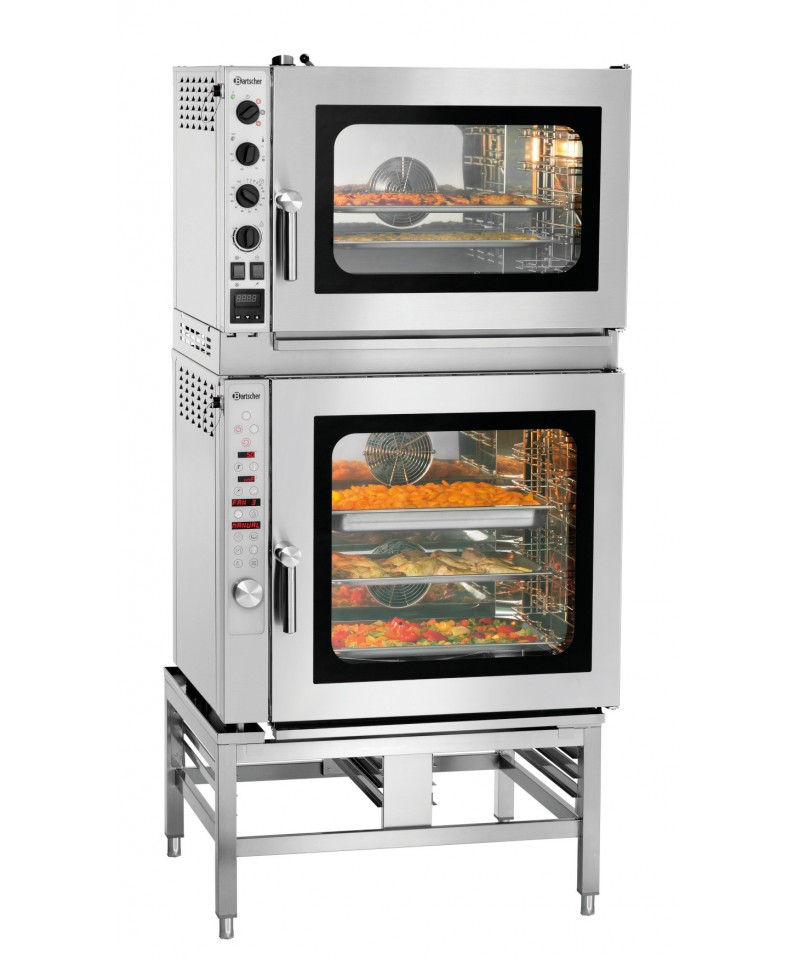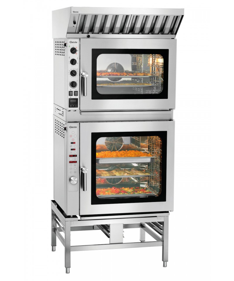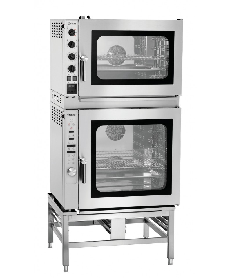 Der extrem niedrige Sockel ermöglicht es, in Kombination mit dem passenden Anschlussset 2 1/1 GN-Kombiöfen übereinander zu stapeln. So kann der Ofen in sicherer Arbeitshöhe betrieben werden.