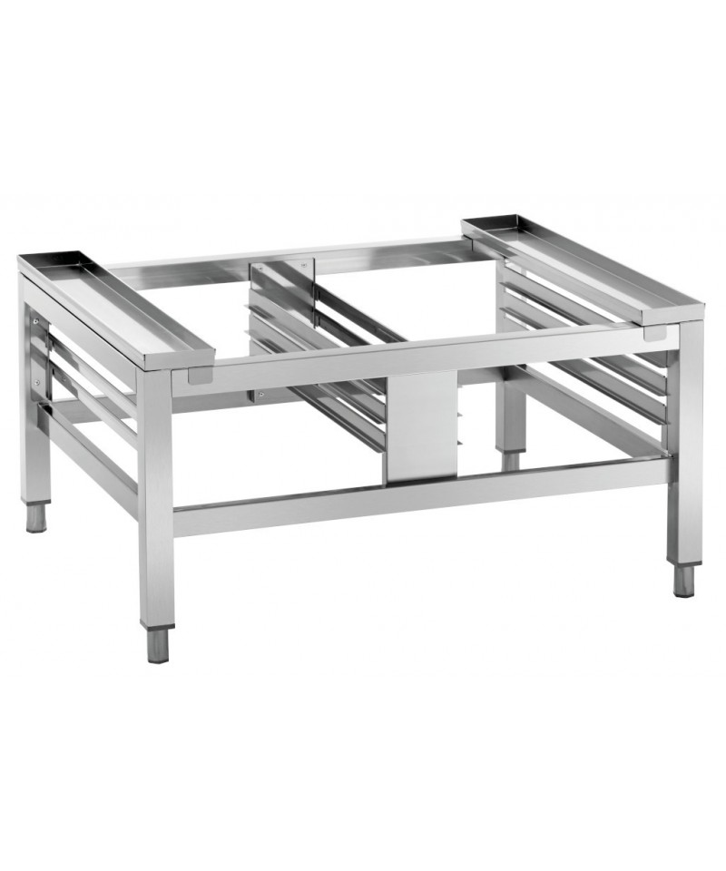 Dieser Sockel ist mit 6 Längsführungen ausgestattet, die ein sicheres und stabiles Aufstellen der Öfen ermöglichen. Die Höhe des Sockels lässt sich von 400 mm bis 450 mm feinjustieren. Das macht die Benutzung der Backöfen bequem und den Zugriff auf die Speisen einfach und komfortabel.