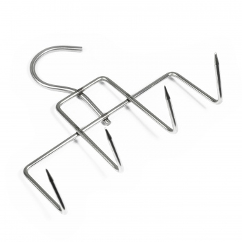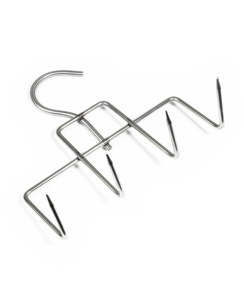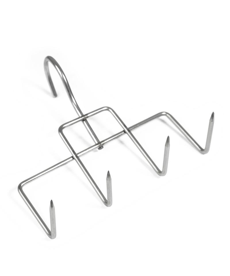 Der Haken ist mit vier robusten Haken ausgestattet, die ein sicheres und stabiles Aufhängen von Speck gewährleisten. Er ist ein Schlüsselelement in der Produktionslinie, in der der Speck an Haken aufgehängt und dann auf Räucherwagen transportiert wird. Diese Wagen mit den voll bestückten Haken fahren in die Räucherkammern ein und ermöglichen einen effizienten und massenhaften Räucherprozess.