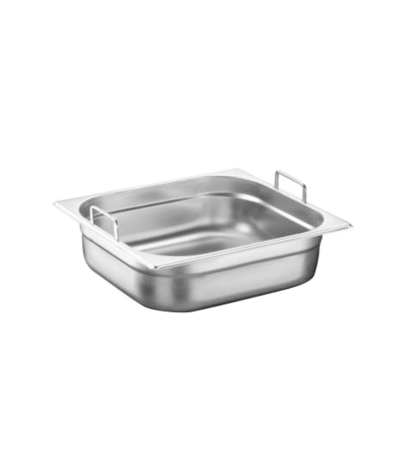 Ein Catering-Behälter aus rostfreiem Stahl, 10 cm hoch. Der Behälter hat die Abmessungen der Gastro-Norm 2/3, ist sehr stabil und langlebig und hat Griffmulden, die das Bewegen des Behälters erleichtern. Geeignet für Catering und Gastronomie. Spülmaschinenfest. Die Behälter sind stapelbar, was die Lagerung erleichtert und den Platzbedarf reduziert.