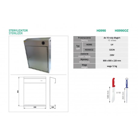 Sterilisator mit Stäben zum Aufhängen von 16 kleinen oder 8 großen Körben mit Messern, Gabeln, Messerschärfern, Metallhandschuhen. Möglichkeit zur Sterilisation anderer zum Aufhängen geeigneter Werkzeuge.