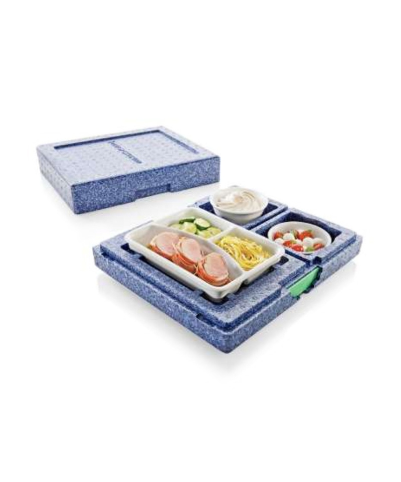 Die Box besteht aus EPP-Material, d.h. aus geschäumtem Polypropylen, das alle Normen erfüllt und keine hygienischen Bedenken aufwirft. Sie eignet sich für warme Mahlzeiten, Suppen, Vorspeisen, Obst oder Desserts. Passt: 1 Porzellanteller, Platz für 2 Thermohauser Porzellanschalen (separat zu erwerben). Er hat eine rutschfeste Oberfläche auf der Innenseite, einen sicheren Verschluss und ist sehr leicht. Gleichzeitig hat er eine hohe Wärmeisolierung.