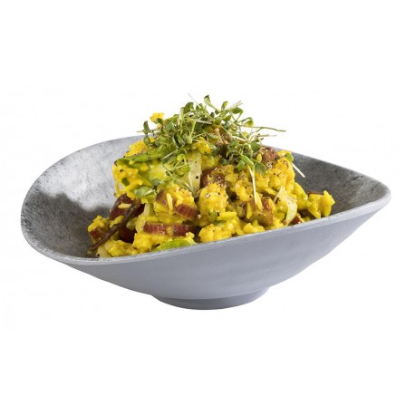 Die ovale Schale ist aus hochwertigem Melamin gefertigt, dessen Oberfläche Beton nachempfunden ist und sich somit perfekt für moderne Kompositionen eignet.