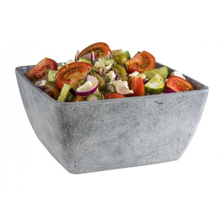Die quadratische Schale ist aus strapazierfähigem Melamin mit einer Oberfläche, die Beton imitiert, und eignet sich daher perfekt für moderne Kompositionen.