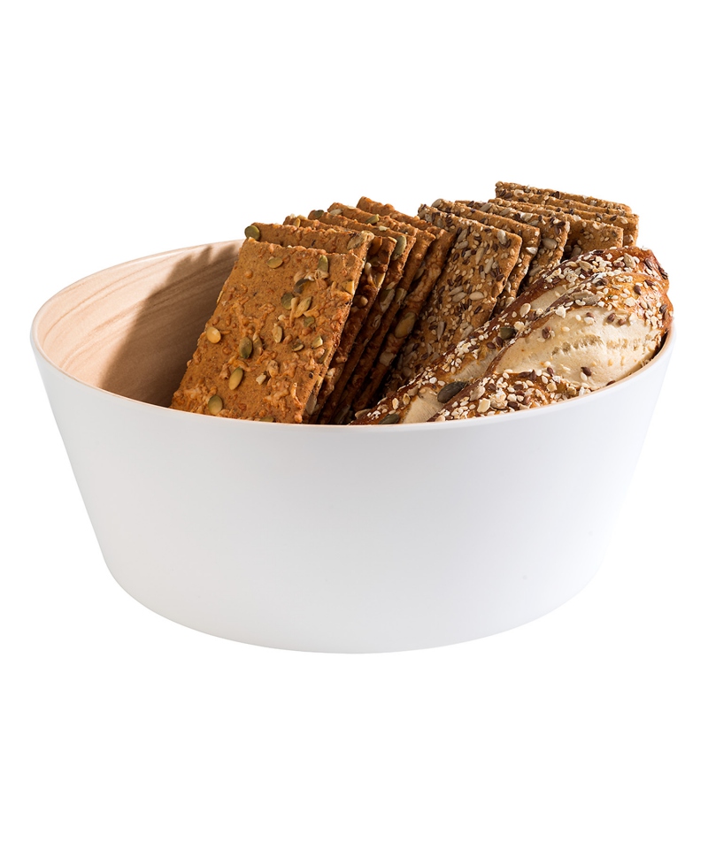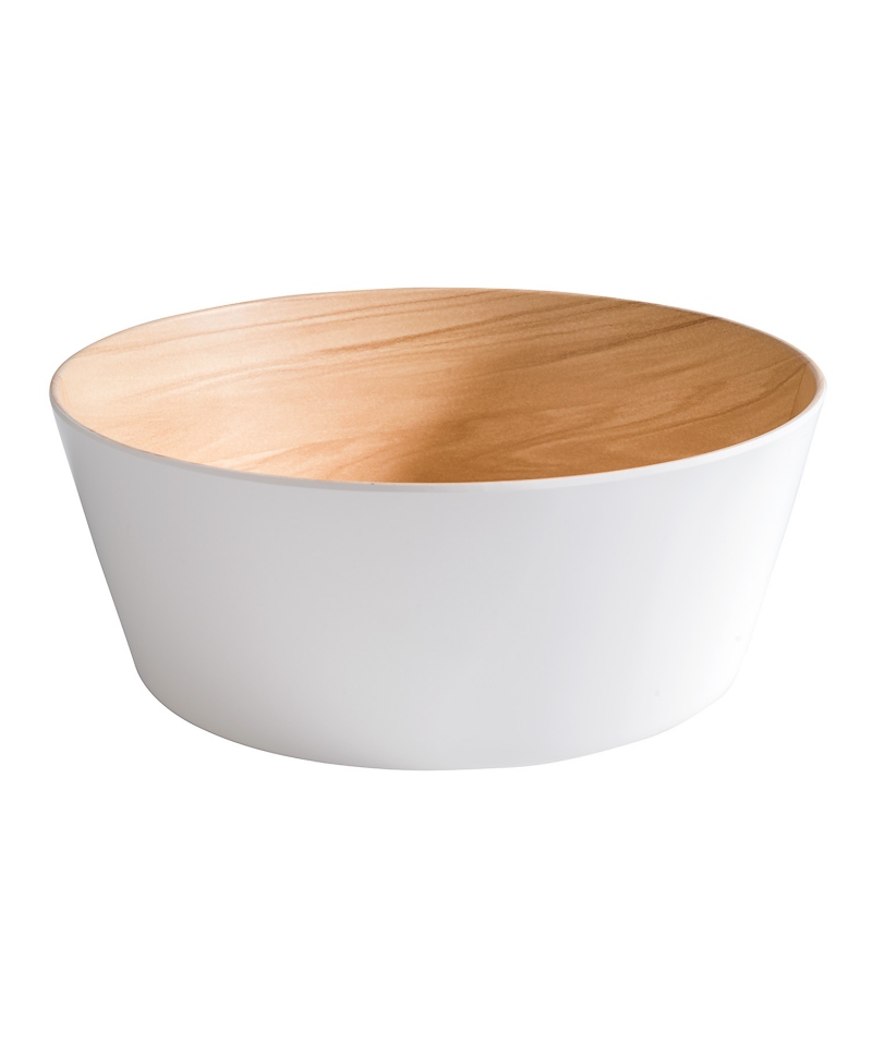 Die Schale aus Melamin, innen aus hellem Holz und außen weiß, ist die ideale Lösung für Buffets und andere Gastronomiebetriebe.