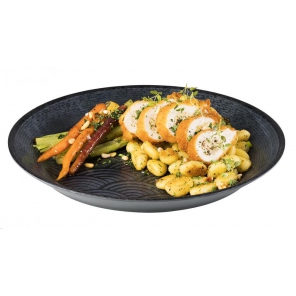 Diese runde Schale aus sehr hartem, stoß- und kratzfestem Melamin stammt aus der Serie "Dark Wave", einer Serie von Behältern, die für den professionellen Einsatz in der Gastronomie entwickelt wurde. Sie kann in Restaurants, Buffets, Caterings, Haushalten, Hochzeitssälen und anderen Gastronomiebetrieben verwendet werden. Die Schale ist hygienisch, säurebeständig und temperaturbeständig von -30°C bis +70°C. Sie ist stapelbar und spülmaschinengeeignet. Das verwendete Material entspricht den Richtlinien EG 1935/2004 und EG 10/2011 der Europäischen Kommission, die die relevanten Vorschriften und Richtlinien für Kunststoffe, die für den Kontakt mit Lebensmitteln zugelassen sind, enthalten.