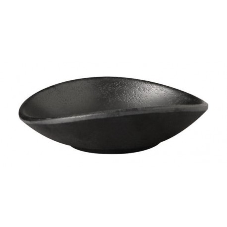 Eine ovale Schale mit interessanter Textur aus Melamin. Ihr Aussehen erinnert täuschend an schwarzes japanisches Steingut.