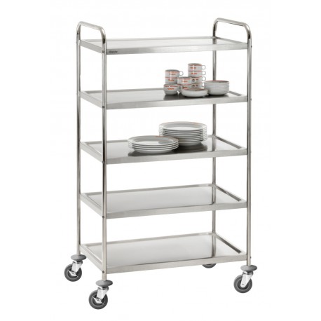Fünf horizontale Etagen: Der Wagen ist mit fünf breiten Ablagen ausgestattet, die reichlich Platz zum Servieren von Speisen und Getränken bieten. Die Möglichkeit, mehrere Gerichte gleichzeitig auf den Wagen zu stellen, macht ihn zu einem unschätzbaren Gerät in Restaurants, Hotels oder Cafés.