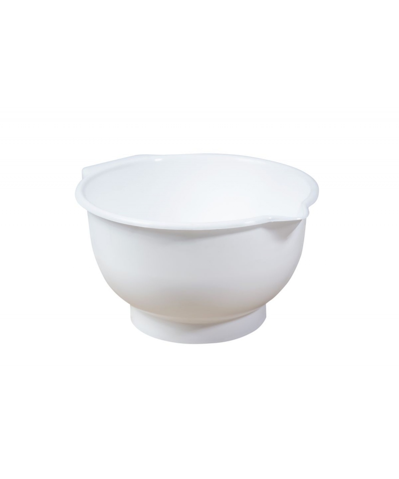 Eine Rührschüssel ist ein unverzichtbares Zubehör für jede Küche oder Bäckerei. Diese Rührschüssel aus weißem Kunststoff (PP) hat ein Fassungsvermögen von ca. 4 Litern und überzeugt durch ihre praktischen Eigenschaften. Die Kunststoff-Rührschüssel verfügt über einen Ausguss, mit dem Sie Flüssigkeiten sauber und tropffrei ausgießen können. Dank des breiten Griffs haben Sie die Schüssel beim Mixen und Pürieren immer gut im Griff. Der stabile Ring an der Unterseite sorgt für einen sicheren Stand auf der Arbeitsfläche.