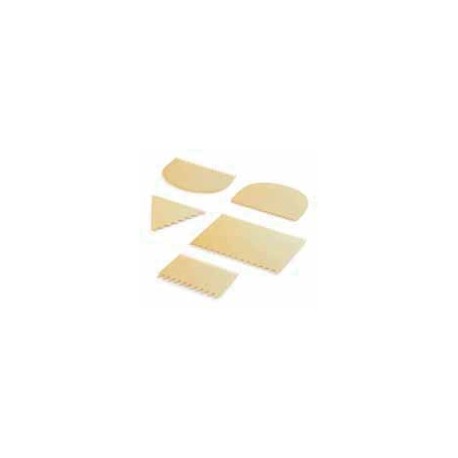 Dieser doppelseitige Zahn-Skraper aus Kunststoff im Format 15 × 10 cm in Elfenbein-Farbe ist ein professionelles Dekorationswerkzeug für Konditoreien, Bäckereien und Gastronomiebetriebe. Mit beiden Seiten gezähnt (verschiedene Zahn-Größen je Seite) erlaubt er vielseitige Oberflächengestaltung von Cremes, Torten und Kuchen. Das Material Polypropylen (PP) ist lebensmittelsicher, flexibel und hitzebeständig bis ca. +105 °C.