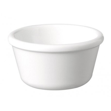 Kleine runde Schale aus weißem Melamin, das Porzellan imitiert. Besonders geeignet zum Servieren von Dips.