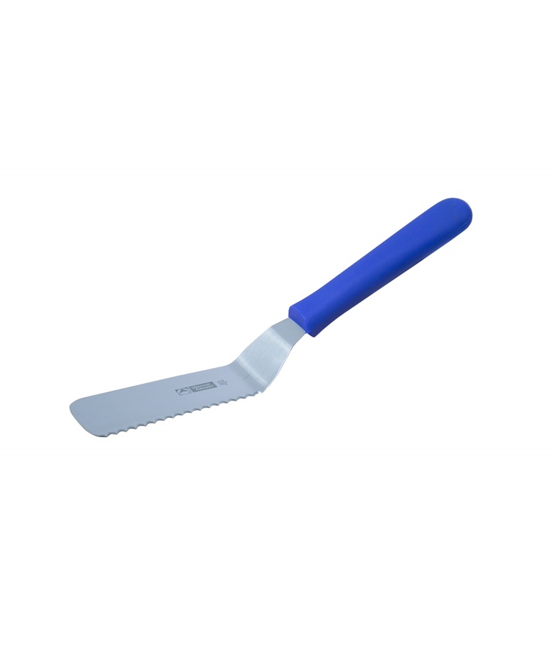 Die speziell gebogenen Teigspatel haben eine Klinge aus hochwertigem Edelstahl und einen ergonomisch geformten Kunststoffgriff in Blau. Der Griff hat eine aufgeraute Oberfläche für eine bessere Griffigkeit.