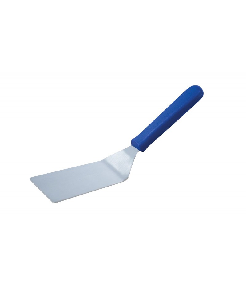 Ein gerader Metall-Spachtel mit 16 cm Klinge ist ein unverzichtbares Werkzeug in gewerblichen Küchen sowie im heimischen Gebrauch. Aus Edelstahl gefertigt und mit einem blauen Kunststoffgriff von etwa 13 cm Länge ausgestattet, bietet er Langlebigkeit, Hygiene und Komfort. Die gerade Gestaltung und stumpfen Klingenränder erlauben sicheres und geschmeidiges Arbeiten beim Servieren, Portionieren oder bei der Arbeit mit Kuchen und Desserts.
