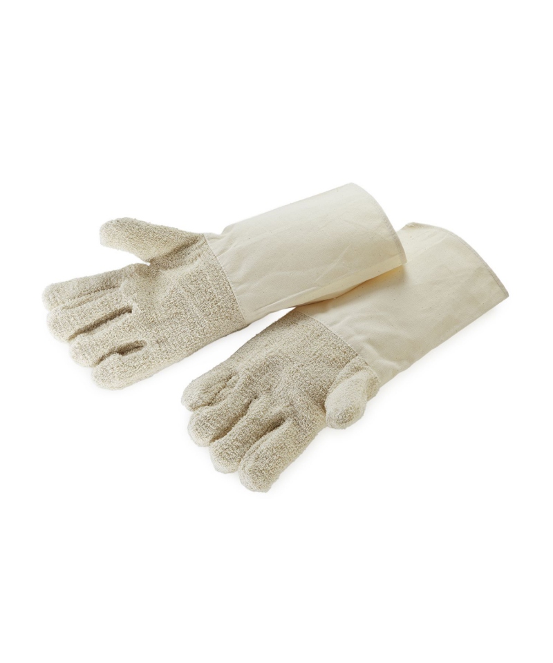 Fünf-Finger-Schutzhandschuhe mit langer Stulpe. Entwickelt zum Schutz vor hohen Temperaturen bis zu 250ºC und besonders geeignet für die Bäckereiindustrie, Konditorei und Großküchen.