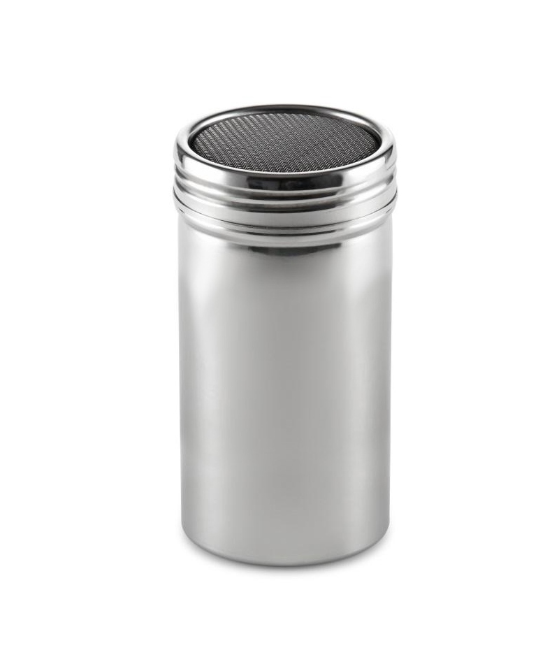 Ein praktischer Behälter mit einem Sieb für Streusel aus rostfreiem Stahl. Äußerst nützlich und unverzichtbar in jeder Küche, auch in Profiküchen, in der gewerblichen Gastronomie sowie in Bäckereien und Konditoreien.